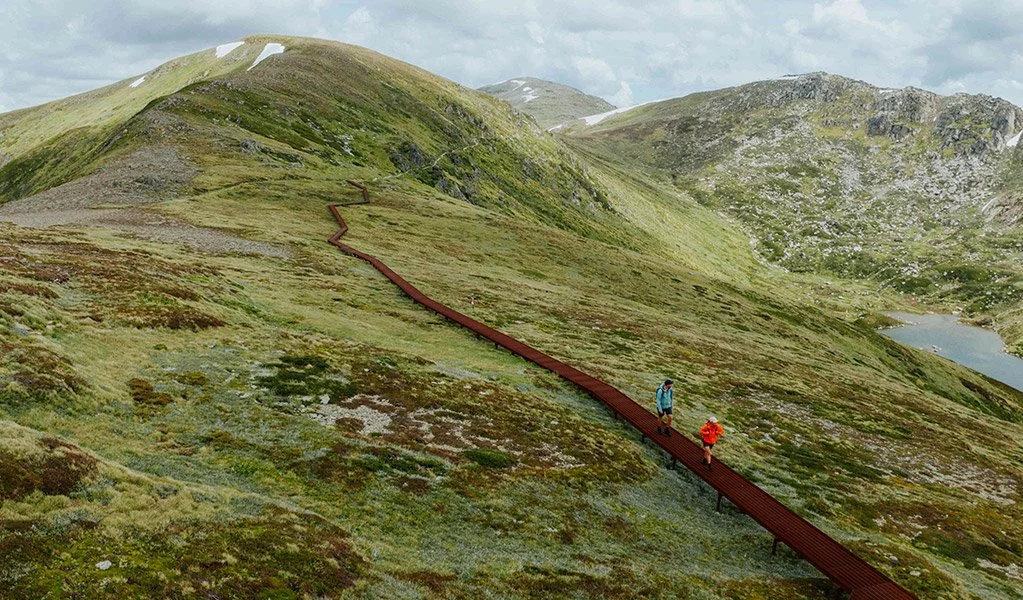 The walk unfolds across the high plains of Kosciuszko National Park, where open country stretches wide beneath an immense sky. Timber boardwalks trace a gentle path through alpine grasses and moss beds, protecting a fragile landscape shaped by wind, frost, and time.